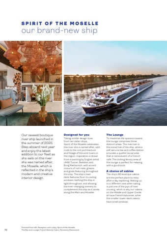 10SPIRIT OF THE MOSELLEour brand-new shipOur newest boutique river ship launched in the summer of 2025. Step aboard next year and enjoy the latest addition to our fleet as she sails on the river she was named after, the Moselle, which is reflected in the ship%u2019s modern and creative interior design.Pictured from left: Reception and Lobby; Spirit of the Moselle; The Bar and Lounge; French Balcony Cabin; Panorama Restaurant.Designed for youTaking similar design cues from her sister ships, Spirit of the Moselle celebrates the river she is named after, with nods to the rich architecture and foliage of the wine towns in the region. Inspiration is drawn from a painting by English artist JMW Turner, Beilstein and Burg Metternich, with accent colours of rich reds, greens and golds featuring throughout the ship. The ship%u2019s main deck features floor-to-ceiling windows, bathing the ship in light throughout, and allowing the ever-changing scenery to complement the ship as it winds along the Main and Moselle.The Lounge To maximise the space on board, the lounge comprises three distinct areas. The main bar is the social hub of the ship, while a self-service tea and coffee station provides a quieter social area that is reminiscent of a French caf%u00e9. The inviting library area of the lounge is perfect for relaxing with a good book.A choice of cabins The ship%u2019s 92 boutique cabins are the perfect place to relax after a day exploring. Waking up to a different view when sailing is just one of the joys of river cruising, which is why our cabins on the Middle and Upper Decks all have French balconies, while the smaller lower-deck cabins have small windows.