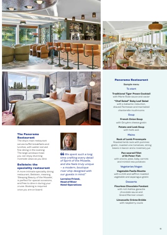 11The Panorama Restaurant The ship%u2019s main restaurant serves buffet breakfasts and lunches, with waiter-served fine dining in the evening. The large windows mean you can enjoy stunning riverside views as you dine.Beilstein: the speciality restaurant A more intimate speciality dining restaurant, Beilstein, meaning %u2018Sleeping Beauty of the Moselle%u2019, is perfect for special occasions, and free to dine in during your cruise. Booking is required once you are on board.We spent such a long time crafting every detail of Spirit of the Moselle, and she feels truly unique %u2013 a modern, boutique river ship designed with our guests in mind.%u201dLorraine Friend, Head of River Hotel OperationsPanorama RestaurantSample menuTo startTraditional Tiger Prawn Cocktailwith Marie Rose sauce and caviar%u201cChef Salad%u201d Baby Leaf Saladwith a balsamic reduction, shaved Parmesan and marinated chanterelle mushroomsSoupFrench Onion Soupwith Gruy%u00e8re cheese gratinPotato and Leek Soupwith herb aioliMainsRack of Lamb Proven%u00e7aleRoasted lamb rack with pommes gratin, roasted vine tomatoes, string beans in bacon and a rosemary jusPan-seared Fillet of St Peter Fishwith onions, peas, baby carrots and minted new potatoesVegetarian/VeganVegetable Paella Risottowith a chilli and saffron roasted vegetable and asparagus gratinDessertsFlourless Chocolate Fondantwith rich Kahl%u00faa ganache chocolate sauce and Grand Marnier creamLimoncello Cr%u00e8me Br%u00fbl%u00e9ewith raspberry coulis