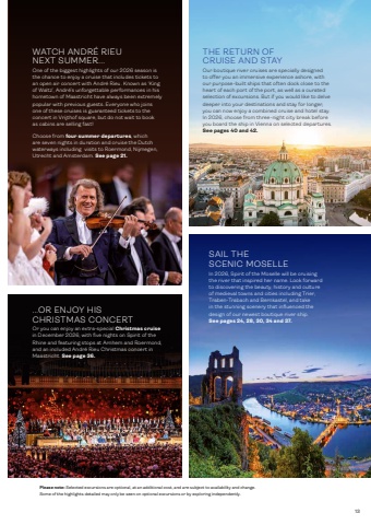 13WATCH ANDR%u00c9 RIEU NEXT SUMMER...One of the biggest highlights of our 2026 season is the chance to enjoy a cruise that includes tickets to an open air concert with Andr%u00e9 Rieu. Known as %u2018King of Waltz%u2019, Andr%u00e9%u2019s unforgettable performances in his hometown of Maastricht have always been extremely popular with previous guests. Everyone who joins one of these cruises is guaranteed tickets to the concert in Vrijthof square, but do not wait to book as cabins are selling fast!Choose from four summer departures, which are seven nights in duration and cruise the Dutch waterways including visits to Roermond, Nijmegen, Utrecht and Amsterdam. See page 21.Please note: Selected excursions are optional, at an additional cost, and are subject to availability and change.Some of the highlights detailed may only be seen on optional excursions or by exploring independently.THE RETURN OF CRUISE AND STAYOur boutique river cruises are specially designed to offer you an immersive experience ashore, with our purpose-built ships that often dock close to the heart of each port of the port, as well as a curated selection of excursions. But if you would like to delve deeper into your destinations and stay for longer, you can now enjoy a combined cruise and hotel stay. In 2026, choose from three-night city break before you board the ship in Vienna on selected departures. See pages 40 and 42....OR ENJOY HIS CHRISTMAS CONCERTOr you can enjoy an extra-special Christmas cruise in December 2026, with five nights on Spirit of the Rhine and featuring stops at Arnhem and Roermond, and an included Andr%u00e9 Rieu Christmas concert in Maastricht. See page 36.SAIL THE SCENIC MOSELLEIn 2026, Spirit of the Moselle will be cruising the river that inspired her name. Look forward to discovering the beauty, history and culture of medieval towns and cities including Trier, Traben-Trabach and Bernkastel, and take in the stunning scenery that influenced the design of our newest boutique river ship. See pages 24, 28, 30, 34 and 37.