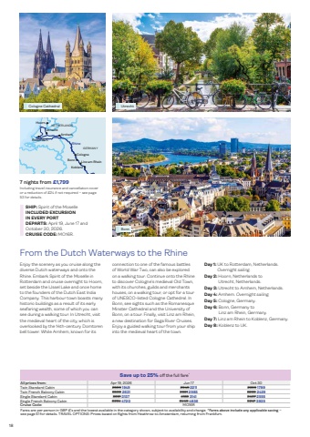 Linz am RheinCologneBonnKoblenzArnhemHoornUtrechtRotterdamGERMANYNETHERLANDSRhine18From the Dutch Waterways to the RhineEnjoy the scenery as you cruise along the diverse Dutch waterways and onto the Rhine. Embark Spirit of the Moselle in Rotterdam and cruise overnight to Hoorn, set beside the IJssel Lake and once home to the founders of the Dutch East India Company. This harbour town boasts many historic buildings as a result of its early seafaring wealth, some of which you can see during a walking tour. In Utrecht, visit the medieval heart of the city, which is overlooked by the 14th-century Domtoren bell tower. While Arnhem, known for its Day 1: UK to Rotterdam, Netherlands. Overnight sailing.Day 2: Hoorn, Netherlands to Utrecht, Netherlands. Day 3: Utrecht to Arnhem, Netherlands. Day 4: Arnhem. Overnight sailing.Day 5: Cologne, Germany. Day 6: Bonn, Germany to Linz am Rhein, Germany. Day 7: Linz am Rhein to Koblenz, Germany. Day 8: Koblenz to UK.SHIP: Spirit of the MoselleINCLUDED EXCURSION IN EVERY PORTconnection to one of the famous battles of World War Two, can also be explored on a walking tour. Continue onto the Rhine to discover Cologne%u2019s medieval Old Town, with its churches, guilds and merchants houses, on a walking tour, or opt for a tour of UNESCO-listed Cologne Cathedral. In Bonn, see sights such as the Romanesque Minster Cathedral and the University of Bonn, on a tour. Finally, visit Linz am Rhein, a new destination for Saga River Cruises. Enjoy a guided walking tour from your ship into the medieval heart of the town.BonnCologne Cathedral UtrechtAll prices from: Apr 19, 2026 Jun 17 Oct 30Twin Standard Cabin 2599 1949 2949 2211 2399 1799Twin French Balcony Cabin 3509 2631 3981 2985 3239 2429Single Standard Cabin 3691 3137 4188 3141 3407 2555Single French Balcony Cabin 6294 4720 6449 4836 5247 3935Cruise Code: MO16RFares are per person in GBP %u00a3%u2019s and the lowest available in the category shown, subject to availability and change. ^Fares above include any applicable saving %u2013 see page 51 for details. TRAVEL OPTIONS: Prices based on flights from Heathrow to Amsterdam, returning from Frankfurt.Save up to 25% o\7 nights from %u00a31,799Including travel insurance and cancellation cover or a reduction of %u00a324 if not required %u2013 see page 53 for details.DEPARTS: April 19, June 17 and October 30, 2026. CRUISE CODE: MO16R.