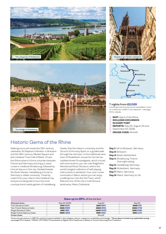 HeidelbergMainz R%u00fcdesheimBaselStrasbourgBreisachGERMANYFRANCERhineThe vineyards of R%u00fcdesheim Strasbourg%u2019s Gothic cathedralThe bridge at Heidelberg31Historic Gems of the RhineWalking tours will reveal the 12th-century cathedral, St Stephan%u2019s Minster, in Breisach and the 16th-century Market Square and late medieval Town Hall of Basel. Cruise the Rhine where it forms a border between France and Germany and enjoy a canal cruise in medieval Strasbourg, followed by time at leisure in the city. Nestled beside the River Neckar, Heidelberg is home to Germany%u2019s oldest university. Travel by coach from your ship to the medieval city and join a local guide to tour the inner courtyard and castle garden of Heidelberg Day 1: UK to Breisach, Germany. Day 2: Breisach. Day 3: Basel, Switzerland. Day 4: Strasbourg, France. Overnight sailing. Day 5: Heidelberg, Germany. Day 6: R%u00fcdesheim, Germany. Day 7: Mainz, Germany. Day 8: Mainz, Germany to UK.SHIP: Spirit of the RhineINCLUDED EXCURSION IN EVERY PORTCastle. See the historic university and the Church of the Holy Spirit on a guided walk through the old town. In the traditional wine town of R%u00fcdesheim, known for its narrow cobbled street Drosselgasse, which is lined with wine taverns, you can visit Siegfried%u2019s Mechanical Music Museum, where the world%u2019s largest collection of self-playing instruments is exhibited. Your river cruise concludes in Mainz, where you can enjoy a walking tour into the Old Town, which features one of the city%u2019s most famous landmarks, Mainz Cathedral.All prices from: May 22, 2026 Aug 30 Sep 20Twin Standard Cabin 2719 2039 2819 2255 2689 2151Twin French Balcony Cabin 3535 2828 3806 2854 3630 2722Single Standard Cabin 3861 3281 4003 3002 3818 2863Single French Balcony Cabin 6585 4938 6166 4624 5881 4410Cruise Code: RH44RFares are per person in GBP %u00a3%u2019s and the lowest available in the category shown, subject to availability and change. ^Fares above include any applicable saving %u2013 see page 51 for details. TRAVEL OPTIONS: Prices based on flights from Heathrow to Basel or Zurich returning from Frankfurt.Save up to 25% o\7 nights from %u00a32,039Including travel insurance and cancellation cover or a reduction of %u00a324 if not required %u2013 see page 53 for details.DEPARTS: May 22, August 30 and September 20, 2026. CRUISE CODE: RH44R.