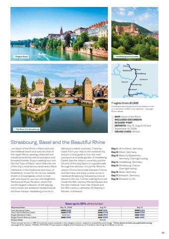 HeidelbergMainz R%u00fcdesheimBaselStrasbourgBreisachGERMANYFRANCERhineElegant Basel Heidelberg and its castleThe River Ill in Strasbourg33Strasbourg, Basel and the Beautiful RhineJoin Spirit of the Rhine in Mainz and visit the medieval towns and cultural cities of the Upper Rhine, passing urbanised and industrial stretches with broad plains and forested foothills. Enjoy a walking tour into the Old Town of Mainz, which features one of the city%u2019s most famous landmarks, Mainz Cathedral. In the traditional wine town of R%u00fcdesheim, known for its narrow cobbled street or Drosselgasse, which is lined with wine taverns, you can visit Siegfried%u2019s Mechanical Music Museum, where the world%u2019s largest collection of self-playing instruments are exhibited. Nestled beside the River Neckar, Heidelberg is home to Day 1: UK to Mainz, Germany. Day 2: Mainz, Germany. Day 3: Mainz to R%u00fcdesheim, Germany. Overnight sailing. Day 4: Heidelberg, Germany. Day 5: Strasbourg, France. Overnight sailing. Day 6: Basel, Germany. Day 7: Breisach, Germany. Day 8: Breisach to UK.SHIP: Spirit of the RhineINCLUDED EXCURSION IN EVERY PORTGermany%u2019s oldest university. Travel by coach from your ship to the medieval city and join a local guide to tour the inner courtyard and castle garden of Heidelberg Castle. See the historic university and the Church of the Holy Spirit on a guided walk through the old town. Cruise the Rhine to where it forms the border between France and Germany and enjoy a canal cruise in medieval Strasbourg, followed by time at leisure in the city. Further walking tours will reveal the 16th-century Market Square and the late medieval Town Hall of Basel and the 12th-century cathedral, St Stephan%u2019s Minster, in Breisach.All prices from: May 15, 2026 Aug 23 Sep 13Twin Standard Cabin 2689 2285 2419 1935 2689 2016Twin French Balcony Cabin 3496 2796 3266 2449 3496 2796Single Standard Cabin Sold Out 3435 2919 3818 2863Single French Balcony Cabin 5881 4998 5291 3968 6511 4883Cruise Code: RH434Fares are per person in GBP %u00a3%u2019s and the lowest available in the category shown, subject to availability and change. ^Fares above include any applicable saving %u2013 see page 51 for details. TRAVEL OPTIONS: Prices based on flights from Heathrow to Frankfurt returning from Basel or Zurich.Save up to 25% o\7 nights from %u00a31,935Including travel insurance and cancellation cover or a reduction of %u00a324 if not required %u2013 see page 53 for details.DEPARTS: May 15, August 23 and September 13, 2026. CRUISE CODE: RH434.