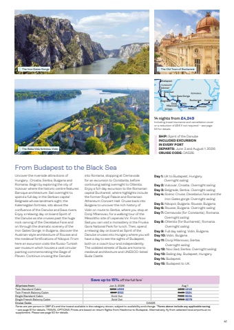 NikopolIron Gate GorgeDonji MilanovacNovi SadDanubeVukovarRousseBelgradeBudapestVidinBucharest Cernavod%u00e5OltenitaBULGARIAHUNGARYSERBIAROMANIA41From Budapest to the Black SeaUncover the riverside attractions of Hungary , Croatia, Serbia, Bulgaria and Romania. Begin by exploring the city of Vukovar where the historic centre features Baroque architecture. Sail overnight to spend a full day in the Serbian capital Belgrade whose landmark sight, the Kalemegdan fortress, sits above the confluence of the Danube and Sava rivers. Enjoy a relaxing day on board Spirit of the Danube as she cruises past the huge rock carving of the Decebalus Face and on through the dramatic scenery of the Iron Gates Gorge. In Bulgaria, discover the Austrian-style architecture of Rousse and the medieval fortifications of Nikopol. From here an excursion visits the Russo-Turkish war museum which houses a vast circular painting commemorating the Siege of Pleven. Continue cruising the Danube Day 1: UK to Budapest, Hungary. Overnight sailing.Day 2: Vukovar, Croatia. Overnight sailing.Day 3: Belgrade, Serbia. Overnight sailing.Day 4: Scenic Cruise, Decebalus Face and the Iron Gates gorge. Overnight sailing.Day 5: Nikopol, Bulgaria. Rousse, Bulgaria.Day 6: Rousse, Bulgaria. Overnight sailing.Day 7: Cernavoda (for Constanta), Romania. Overnight sailing.Day 8: Oltenita (for Bucharest), Romania. Overnight sailing.Day 9: Full day sailing. Vidin, Bulgaria.Day 10: Vidin, Bulgaria.Day 11: Donji Milanovac, Serbia. Overnight sailing.Day 12: Novi Sad, Serbia. Overnight sailing.Day 13: Sailing day. Budapest, Hungary.Day 14: Budapest.Day 15: Budapest to UK.SHIP: Spirit of the DanubeINCLUDED EXCURSION IN EVERY PORTinto Romania, stopping at Cernavoda for an excursion to Constanta, before continuing sailing overnight to Oltenita. Enjoy a full-day excursion to the Romanian capital Bucharest, where highlights include the former Royal Palace and Romanian Atheneum Concert Hall. Cruise back into Bulgaria to uncover the rich history of Vidin on route to Serbia, where you stop at Donji Milanovac, for a walking tour of the Mesolithic site of Lepenski Vir. From Novi Sad you can visit a monastery in the Fruska Gora National Park for lunch. Then, spend a relaxing day on board as Spirit of the Danube cruises into Hungary where you will have a day to see the sights of Budapest, both on a coach tour and independently. The cobbled streets of Buda are home to medieval architecture and UNESCO-listed Buda Castle.The Old Town of BucharestThe Baba Vida fortress, VidinThe Iron Gates GorgeAll prices from: Jun 3, 2026 Aug 1Twin Standard Cabin 5259 4996 4999 4249Twin French Balcony Cabin 6837 6153 6499 5524Single Standard Cabin Sold Out 7099 6034Single French Balcony Cabin Sold Out 12106 9079Cruise Code: DA526Fares are per person in GBP %u00a3%u2019s and the lowest available in the category shown, subject to availability and change. ^Fares above include any applicable saving%u2013 see page 51 for details. TRAVEL OPTIONS: Prices are based on return flights from Heathrow to Budapest. Alternatively, fly from selected local airports at no supplement. Please see page 50 for details.Save up to 15% o! the full fare^14 nights from %u00a34,249Including travel insurance and cancellation cover or a reduction of %u00a356 if not required %u2013 see page 53 for details.DEPARTS: June 3 and August 1, 2026. CRUISE CODE: DA526.