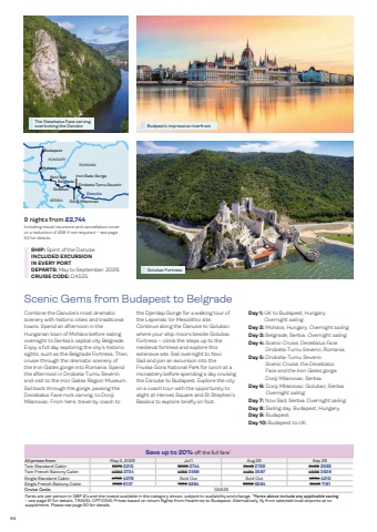 Iron Gate GorgeDrobeta-Turnu Severin BelgradeDonji MilanovacNovi SadBudapestMoh%u00e1csHUNGARYSERBIAROMANIADanubeGolubac44Scenic Gems from Budapest to BelgradeCombine the Danube%u2019s most dramatic scenery with historic cities and traditional towns. Spend an afternoon in the Hungarian town of Moh%u00e1cs before sailing overnight to Serbia%u2019s capital city Belgrade. Enjoy a full day exploring the city%u2019s historic sights, such as the Belgrade Fortress. Then, cruise through the dramatic scenery of the Iron Gates gorge into Romania. Spend the afternoon in Drobeta-Turnu Severin and visit to the Iron Gates Region Museum. Sail back through the gorge, passing the Decebalus Face rock carving, to Donji Milanovac. From here, travel by coach to Day 1: UK to Budapest, Hungary. Overnight sailing.Day 2: Moh%u00e1cs, Hungary. Overnight sailing.Day 3: Belgrade, Serbia. Overnight sailing.Day 4: Scenic Cruise, Decebalus Face. Drobeta-Turnu Severin, Romania.Day 5: Drobeta-Turnu Severin. Scenic Cruise, the Decebalus Face and the Iron Gates gorge.Donji Milanovac, Serbia.Day 6: Donji Milanovac. Golubac, Serbia. Overnight sailing.Day 7: Novi Sad, Serbia. Overnight sailing.Day 8: Sailing day. Budapest, Hungary.Day 9: Budapest.Day 10: Budapest to UK.SHIP: Spirit of the DanubeINCLUDED EXCURSION IN EVERY PORTthe Djerdap Gorge for a walking tour of the Lepenski Vir Mesolithic site.Continue along the Danube to Golubac where your ship moors beside Golubac Fortress %u2013 climb the steps up to the medieval fortress and explore this extensive site. Sail overnight to Novi Sad and join an excursion into the Fruska Gora National Park for lunch at a monastery before spending a day cruising the Danube to Budapest. Explore the city on a coach tour with the opportunity to alight at Heroes Square and St Stephen%u2019s Basilica to explore briefly on foot.Golubac FortressBudpest%u2019s impressive riverfrontThe Decebalus Face carving overlooking the DanubeSave up to 20% o! the full fare^9 nights from %u00a32,744Including travel insurance and cancellation cover or a reduction of %u00a356 if not required %u2013 see page 53 for details.DEPARTS: May to September, 2026. CRUISE CODE: DA525.All prices from: May 3, 2026 Jul 1 Aug 29 Sep 29Twin Standard Cabin 3379 3210 3229 2744 3449 2759 3489 2965Twin French Balcony Cabin 4393 3734 4198 3568 4484 3587 4536 3628Single Standard Cabin 4798 4078 Sold Out Sold Out 4954 4210Single French Balcony Cabin 8183 6137 7819 5864 8352 6264 8449 7181Cruise Code: DA525Fares are per person in GBP %u00a3%u2019s and the lowest available in the category shown, subject to availability and change. ^Fares above include any applicable saving%u2013 see page 51 for details. TRAVEL OPTIONS: Prices based on return flights from Heathrow to Budapest. Alternatively, fly from selected local airports at no supplement. Please see page 50 for details.