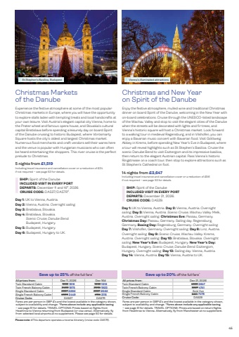 Vienna%u2019s illuminated attractions45Christmas Markets of the DanubeExperience the festive atmosphere at some of the most popular Christmas markets in Europe, where you will have the opportunity to explore stalls laden with tempting treats and local handicrafts at your own leisure. Visit Austria%u2019s elegant capital city Vienna, home to the Prater wheel and famous opera house, and Slovakia%u2019s cultural capital Bratislava before spending a leisurely day on board Spirit of the Danube cruising to historic Budapest, where V%u00f6r%u00f6smarty Square hosts the city%u2019s oldest and largest Christmas market. Numerous food merchants and craft vendors sell their wares here and the venue is popular with Hungarian musicians who can often be heard entertaining the shoppers. This river cruise is the perfect prelude to Christmas.SHIP: Spirit of the DanubeINCLUDED VISIT IN EVERY PORTPlease note: #This departure operates a reverse itinerary (cruise code: DA57R).Day 1: UK to Vienna, Austria.Day 2: Vienna, Austria. Overnight sailing.Day 3: Bratislava, Slovakia.Day 4: Bratislava, Slovakia. Scenic Cruise, Danube Bend. Budapest, Hungary.Day 5: Budapest, Hungary.Day 6: Budapest, Hungary to UK.St Stephen%u2019s Basilica, BudapestChristmas and New Year on Spirit of the DanubeEnjoy the festive atmosphere, mulled wine and traditional Christmas dinner on board Spirit of the Danube, welcoming in the New Year with on-board celebrations. Cruise through the UNESCO-listed landscape of the Wachau Valley and stop to visit the elegant cities of the Danube when the streets will be decorated with lights and fir trees, and Vienna%u2019s historic square will host a Christmas market. Look forward to a walking tour in medieval Regensburg, and in Vilshofen, you can enjoy a Bavarian music concert with Bavarian food. Visit G%u00f6ttweig Abbey in Krems, before spending New Year%u2019s Eve in Budapest, where a tour will reveal highlights such as St Stephen%u2019s Basilica. Cruise the scenic Danube Bend to visit Esztergom and its impressive basilica, then return to the elegant Austrian capital. Pass Vienna%u2019s historic Ringstrasse on a coach tour, then stop to explore attractions such as St Stephen%u2019s Cathedral on foot.SHIP: Spirit of the DanubeINCLUDED VISIT IN EVERY PORTDay 1: UK to Vienna, Austria. Day 2: Vienna, Austria. Overnight sailing. Day 3: Vienna, Austria. Scenic Cruise, Wachau Valley. Melk, Austria. Overnight sailing. Christmas Eve: Passau, Germany. Christmas Day: Passau, Germany. Sailing day. Regensburg, Germany. Boxing Day: Regensburg, Germany. Overnight sailing. Day 7: Vilshofen, Germany. Overnight sailing. Day 8: Linz, Austria. Overnight sailing. Day 9: Scenic Cruise, Wachau Valley. Krems, Austria. Overnight sailing. Day 10: Bratislava, Slovakia. Overnight sailing. New Year%u2019s Eve: Budapest, Hungary. New Year%u2019s Day:Budapest, Hungary. Scenic Cruise, Danube Bend. Esztergom, Hungary. Overnight sailing. Day 13: Sailing day. Vienna, Austria. Day 14: Vienna, Austria. Day 15: Vienna, Austria to UK.Save up to 25% o! the full fare^5 nights from %u00a31,519Including travel insurance and cancellation cover or a reduction of %u00a324 if not required %u2013 see page 53 for details.DEPARTS: December 11 and 16#, 2026. CRUISE CODE: DA527/DA57R#.All prices from: Dec 11, 2026 Dec 16#Twin Standard Cabin 1899 1519 1899 1519Twin French Balcony Cabin 2469 1975 2564 1923Single Standard Cabin 2697 2292 2697 2022Single French Balcony Cabin 4599 3449 4154 3115Cruise Code: DA527 DA57RFares are per person in GBP %u00a3%u2019s and the lowest available in the category shown, subject to availability and change. ^Fares above include any applicable saving%u2013 see page 51 for details. TRAVEL OPTIONS: Prices based on flights from Heathrow to Vienna returning from Budapest (or visa versa). Alternatively, fly from selected local airports at no supplement. Please see page 50 for details.Save up to 20% o! the full fare^14 nights from %u00a33,647Including travel insurance and cancellation cover or a reduction of %u00a356 if not required %u2013 see page 53 for details.DEPARTS: December 21, 2026. CRUISE CODE: DA529.All prices from: Dec 21, 2026Twin Standard Cabin 4559 3647Twin French Balcony Cabin 5927 4741Single Standard Cabin Sold OutSingle French Balcony Cabin 9971 7478Cruise Code: DA529Fares are per person in GBP %u00a3%u2019s and the lowest available in the category shown, subject to availability and change. ^Fares above include any applicable saving%u2013 see page 51 for details. TRAVEL OPTIONS: Prices are based on return flights from Heathrow to Vienna. Alternatively, fly from Manchester at no supplement.