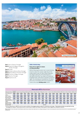 Oporto and the Douro River47Lisbon%u2019s Alfama districtDay 1: UK to Oporto, Portugal.Day 2: Oporto to R%u00e9gua, Portugal to Pinh%u00e3o, Portugal.Day 3: Pinh%u00e3o.Day 4: Pinh%u00e3o to Barca d%u2019Alva, Portugal.Day 5: Barca d%u2019Alva to Pocinho, Portugal.Day 6: Pocinho to R%u00e9gua, Portugal.Day 7: Oporto, Portugal.Day 8: Oporto to UK.Add a hotel stayEnjoy three nights in Lisbon on selected dates Before following the same river cruise itinerary, travel to Lisbon for a three-night stay at the locally rated 4-star HF F%u00e9nix Lisbon opposite the elegant Marqu%u00eas of Pombal Square, in the heart of the city. Your stay is on a bed and breakfast basis, with dinner included on the first night. You can enjoy an included tour of Lisbon, plus a tour of Coimbra with lunch included on route to the ship. Holiday code: DU101.Save up to 25% o! the full fare^All prices from: Jul 30, 2026 Aug 6 Aug 13 Aug 20 Aug 27 Sep 3 Sep 10 Sep 17 Sep 24 Oct 1 Oct 8 Oct 22 Oct 22 Oct 29 Nov 5 Nov 12 Nov 19 Nov 26Twin Standard Cabin289221692892231328922313291423313279245936572742365729253621289630492439351528123421256533032477318523882629210329492211258419382452196123091847Twin French Balcony Cabin362829023628290236282902378828413891311243393471433936884297343742693628417133364059324739193135391429353812285936242718324224313076230728972317Twin French Balcony Suite *473235494732378547323549476835765141385557334586573345865678454256414230551141335363402251783883499337444864364846233467422831714012300937782833Single Standard CabinSold Out433836874338368743713715508243195668481756684251Sold Out55774740544840865303450751204352493741964808408645713428387629073678312634642944Single French Balcony Cabin680951066390479263904792644048307713578486016450786558987788584184626346826862018046603471036037685051376671500363424756571042825773432951033827Cruise Code: DU100Fares are per person in GBP %u00a3%u2019s and the lowest available in the category shown, subject to availability and change. ^Fares above include any applicable saving%u2013 see page 51 for details. *Fares shown are for a Junior Suite. TRAVEL OPTIONS: Prices based on return flights from Gatwick to Oporto.Please note: On Douro Serenity, French Balcony cabins have a window that slides down to a railing, allowing you to lean out and enjoy the view and some fresh air, but no actual balcony space to step onto.