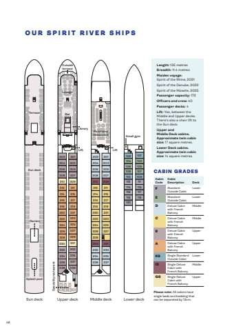 48Cabin CodeCabin Description DeckF Standard Outside CabinLowerE Standard Outside CabinLowerD Deluxe Cabin with French BalconyMiddleC Deluxe Cabin with French BalconyMiddleB Deluxe Cabin with French BalconyUpperA Deluxe Cabin with French BalconyUpperKS Single Standard Outside CabinLowerIS Single Deluxe Cabin with French BalconyMiddleGS Single Deluxe Cabin with French BalconyUpper119117115111109107105103120118116114112110108106104301 102303305307309311315317319321323325327329331333335337302304306308310312314316318320322324326328330332334336201203205207209211215217219221223225227231233235237202204206208210212214216218220222224226228230232234236338 339101Lift LiftOutsideterraceLoungeSmall gymSpeciality restaurantGamesSplash poolSun deckTerracePanoramarestaurantLibraryBarSun deck Upper deck Middle deck Lower deckLength: 135 metresBreadth: 11.4 metresMaiden voyage: Spirit of the Rhine, 2021Spirit of the Danube, 2022Spirit of the Moselle, 2025Passenger capacity: 172Officers and cre 40Passenger decks: 4Lift: Yes, between the Middle and Upper decks. There%u2019s also a chair lift to the Sun deck.Upper and Middle Deck cabins.Approximate twin cabin size: 17 square metres.Lower Deck cabins.Approximate twin cabin size: 14 square metres.OUR SPIRIT RIVER SHIPSCABIN GRADESPlease note: All cabins have single beds and bedding that can be separated by 13cm.