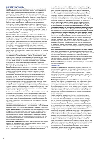52BEFORE YOU TRAVELPassports: You will need a valid passport for all cruises featured. As requirements vary and can change without notice, we strongly advise you to ensure that your passport is valid for at least six months after the end of your cruise. We recommend that you have at least three blank pages in your passport to cover potential immigration formalities, which may be required in some countries. We recommend that you also take your passport for identification purposes when taking domestic flights. To meet Border Force security check requirements, Saga requires certain passport information from you and your party in advance of your departure date. We will ask for this information at the time of booking. A failure to provide the passport information prior to your departure date may result in you and your party being denied boarding. If you or a member of your party are denied boarding in these circumstances, this will be treated as a cancellation.Visas and ETAs: Unless we advise you otherwise at the time of booking, your specific passport and visa requirements, and other immigration requirements are your responsibility, and you should confirm these with the relevant Embassies and/or Consulates. We do not accept any responsibility if you cannot travel because you have not complied with any passport, visa or immigration requirements.From 2025 it is expected that a full British citizen resident in the UK will need an ETIAS travel authorisation in order to enter most EU member states. You will be responsible for obtaining this authorisation before travel and you are also responsible for ensuring that you do not breachany restrictions governing your length of stay in these countries. If you are a British citizen resident in the UK, you may wish to refer to government advice at https://www.gov.uk/browse/abroad. Travel advice: The Foreign, Commonwealth and Development Office (FCDO) Travel Advice Unit provides up-to-date advice and safety information for British nationals travelling abroad. Please visit gov.uk/foreign-travel-advice for further information. We recommend you regularly check this information.Health screening: We will require you to complete our pre-boarding health questionnaire, comply with any of our health screening requirements (including, without limitation, mandatory testing for COVID-19) and to supply full and accurate information of any symptoms of or positive tests for viral or bacterial illness you or a member of your party may have including, without limitation, COVID-19. We also require you to inform us of any recent close contact you or any member of your party may have had with someone suspected of or known to have a viral or bacterial illness including, without limitation, COVID-19. Refusal to complete our questionnaire or comply with our health screening requirements may result in you being denied boarding. If you are denied boarding in any of these circumstances, this will be treated as a cancellation by you and cancellation charges may apply. Further, to avoid the spread of any viral or bacterial illness on board including, without limitation, COVID-19, we may deny boarding to any passenger who displays symptoms of any such illness or who in our reasonable opinion may be at risk of having contracted any such illness. If you are denied boarding in these circumstances, you will not be entitled to a refund but you may amend your cruise to a different date.COVID-19 vaccinations: We recommendthat all passengers are vaccinated and boosted against COVID-19 using a COVID-19 vaccine approved by the UK%u2019s Medical and Healthcare Regulatory Authority. Other vaccinations: We will advise you with your holiday confirmation of any other vaccinations that are required as a condition of entry to the country(ies) that you are visiting. We recommend that you consult your doctor at least 12 weeks before departure, and they will advise you about any other vaccinations required. You may also wish to refer to government health advice for your destination at gov.uk/foreign-travel-advice. Mobility and assistance: None of our river cruise ships have cabins adapted for use by those with restricted mobility, and the use of wheelchairs onboard is not permitted.We reserve the right to refuse the carriage of any person if carrying such a passenger would breach applicable safety requirements or law. We also reserve the right to refuse carriage if the design of the vessel and/or the port infrastructure and equipment would make carriage unsafe or not operationally feasible. We reserve the right to require that a disabled passenger or a passenger of reduced mobility is accompanied by another fare paying person capable of providing assistance to ensure compliance with any applicable safety requirement or law or if the design of the vessel and/or the port infrastructure and equipment means that a disabled passenger or person of reduced mobility cannot be carried in a safe or operationally feasible manner without the assistance of another person. Please advise us at the time of booking if you or any member of your party has reduced mobility or would require assistance in an emergency, or as soon as possible before departure should there be a change in circumstances. If you do not inform us of such a condition we will not be liable if any airline (where applicable) refuses to accept you or any member of your party as a passenger. If you are disabled or have difficulty moving around, you are legally entitled to receive assistance when you fly. This free service is available to anyone with mobility problems, for example, because of your disability, age or a temporary injury. To take full advantage of the service you need to book at least 48 hours in advance of your flight. Please contact us as soon as possible prior to departure. You can also visit our website travel.saga.co.uk. Please note that personal daily care cannot be provided by any member of the ship%u2019s staff.Food allergies or spe