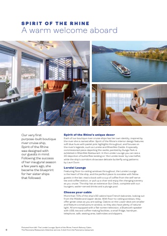6SPIRIT OF THE RHINEA warm welcome aboardOur very first purpose-built boutiqueriver cruise ship, Spirit of the Rhinewas designed with our guests in mind.Following the success of her inaugural season a few years ago, she became the blueprint for her sister ships that followed.Pictured from left: The Lorelei Lounge; Spirit of the Rhine; French Balcony Cabin; The Panorama Restaurant; Attentive service; A dish from the Panorama restaurant.Spirit of the Rhine%u2019s unique decorEach of our boutique river cruise ships has her own identity, inspired by the river she is named after. Spirit of the Rhine%u2019s interior design features soft blue hues with pastel pink highlights throughout, and focuses on the river%u2019s legends, such as Lorelei and Rheinfels Castle. A specially commissioned piece depicting the castle, painted by Sunga Park is exhibited in Rheinfels Restaurant. In the Lorelei Lounge you can see a 3D depiction of butterflies landing on %u2018the Lorelei book%u2019 by Lisa Haftel, while the ship%u2019s corridors showcase delicate butterfly wing patterns by Lauri Dunn.Lorelei LoungeFeaturing floor-to-ceiling windows throughout, the Lorelei Lounge is the heart of the ship, and the perfect place to socialise with fellow guests in the bar, read a book with a cup of coffee from the self-serve tea and coffee station, or pull up a chair and enjoy the changing scenery as you cruise. The ship has an extensive Sun Deck, complete with sun loungers, waiter-served drinks and a plunge pool.Choose your cabinMore than 75% of the ship%u2019s 92 cabins have French balconies, looking out from the Middle and Upper decks. With floor-to-ceiling windows, they offer great views as you are sailing. Cabins on the Lower deck are smaller and feature a small picture window, so they also have plenty of natural light. All are equipped with a flat-screen television, a Bluetooth speaker with USB, tea and coffee-making facilities, a small fridge, hairdryer, telephone, safe, seating area, bathrobes and slippers.