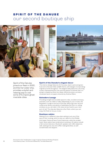 8SPIRIT OF THE DANUBEour second boutique shipSpirit of the Danube joined our fleet in 2022, and like her sister ship, provides a stylish and relaxing way to visit some of Europe%u2019s great riverside cities.Pictured from left: The Belvedere Lounge; Hungarian Parliament Building, Budapest; French Balcony Cabin; The Panorama Restaurant; The Delta Restaurant.Spirit of the Danube%u2019s elegant decorThe interior design features Art Nouveau style in pink and green hues and a Danube Delta wildlife theme, with designs incorporating migratory birds throughout. The elegant lobby features a stunning mosaic representing the river and the places of interest that run along it created by artist Ann Bubis. While the ship%u2019s corridors showcase hand-cut paper artworks by Andrew Malon.Belvedere LoungeProviding a bright and sociable space to relax, socialise and enjoy activities, such as crafts or talks (depending on your cruise), the Belvedere Lounge is the hub of the ship, featuring a bar, tea and coffee area, library and plenty of seating by the floor-to-ceiling windows so you can take in the views as you head to your next port of call. The ship also features a Sun Deck, where you can enjoy the fresh air as you cruise.Boutique cabinsWaking up to a different view when sailing is just one of the joys of river cruising, which is why our cabins on the Middle and Upper Decks all have French balconies, while the smaller lower-deck cabins have small picture windows. All cabins include a flat-screen television, Bluetooth speaker with USB, telephone, safe, seating area, tea and coffee-making facilities, as well as bathrobes and slippers.