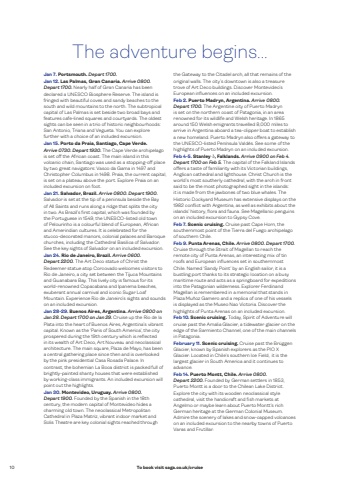 10 To book visit saga.co.uk/cruiseJan 7. Portsmouth. Depart 1700.Jan 12. Las Palmas, Gran Canaria. Arrive 0800.Depart 1700. Nearly half of Gran Canaria has been declared a UNESCO Biosphere Reserve. The island is fringed with beautiful coves and sandy beaches to the south and wild mountains to the north. The subtropical capital of Las Palmas is set beside two broad bays and features cafe-lined squares and courtyards. The oldest sights can be seen in a trio of historic neighbourhoods: San Antonio, Triana and Vegueta. You can explore further with a choice of an included excursion.Jan 15. Porto da Praia, Santiago, Cape Verde.Arrive 0730. Depart 1930. The Cape Verde archipelago is set o! the African coast. The main island in this volcanic chain, Santiago was used as a stopping-o! place by two great navigators: Vasco da Gama in 1497 and Christopher Columbus in 1498. Praia, the current capital, is set on a plateau above the port. Explore Praia on an included excursion on foot.Jan 21. Salvador, Brazil. Arrive 0800. Depart 1900.Salvador is set at the tip of a peninsula beside the Bay of All Saints and runs along a ridge that splits the city in two. As Brazil%u2019s first capital, which was founded by the Portuguese in 1549, the UNESCO-listed old town of Pelourinho is a colourful blend of European, African and Amerindian cultures. It is celebrated for the stucco-decorated manors, colonial palaces and Baroque churches, including the Cathedral Basilica of Salvador. See the key sights of Salvador on an included excursion.Jan 24. Rio de Janeiro, Brazil. Arrive 0600.Depart 2200. The Art Deco statue of Christ the Redeemer statue atop Corcovado welcomes visitors to Rio de Janeiro, a city set between the Tijuca Mountains and Guanabara Bay. This lively city is famous for its world-renowned Copacabana and Ipanema beaches, exuberant annual carnival and iconic Sugar Loaf Mountain. Experience Rio de Janeiro%u2019s sights and sounds on an included excursion.Jan 28-29. Buenos Aires, Argentina. Arrive 0800 on Jan 28. Depart 1700 on Jan 29. Cruise up the Rio de la Plata into the heart of Buenos Aires, Argentina%u2019s vibrant capital. Known as the %u2018Paris of South America%u2019, the city prospered during the 19th century which is reflected in its wealth of Art Deco, Art Nouveau and neoclassical architecture. The main square, Plaza de Mayo, has been a central gathering place since then and is overlooked by the pink presidential Casa Rosada Palace. In contrast, the bohemian La Boca district is packed full of brightly-painted shanty houses that were established by working-class immigrants. An included excursion will point out the highlights.Jan 30. Montevideo, Uruguay. Arrive 0800.Depart 1900. Founded by the Spanish in the 18th century, the modern capital of Montevideo hides a charming old town. The neoclassical Metropolitan Cathedral in Plaza Matriz, vibrant indoor market and Solis Theatre are key colonial sights reached through the Gateway to the Citadel arch, all that remains of the original walls. The city%u2019s downtown is also a treasure trove of Art Deco buildings. Discover Montevideo%u2019s European influences on an included excursion.Feb 2. Puerto Madryn, Argentina. Arrive 0800.Depart 1700. The Argentine city of Puerto Madryn is set on the northern coast of Patagonia, in an area renowned for its wildlife and Welsh heritage. In 1865 around 150 Welsh emigrants travelled 8,000 miles to arrive in Argentina aboard a tea-clipper boat to establish a new homeland. Puerto Madryn also o!ers a gateway to the UNESCO-listed Pen%u00ednsula Vald%u00e9s. See some of the highlights of Puerto Madryn on an included excursion.Feb 4-5. Stanley , Falklands. Arrive 0900 on Feb 4.Depart 1700 on Feb 5. The capital of the Falkland Islands o!ers a taste of familiarity with its Victorian buildings, Anglican cathedral and lighthouse. Christ Church is the world%u2019s most southerly cathedral, with the arch in front said to be the most photographed sight in the islands: it is made from the jawbones of two blue whales. The Historic Dockyard Museum has extensive displays on the 1982 conflict with Argentina, as well as exhibits about the islands%u2019 history, flora and fauna. See Magellanic penguins on an included excursion to Gypsy Cove.Feb 7. Scenic cruising. Cruise past Cape Horn, the southernmost point of the Tierra del Fuego archipelago of southern Chile.Feb 9. Punta Arenas, Chile. Arrive 0800. Depart 1700.Cruise through the Strait of Magellan to reach the remote city of Punta Arenas, an interesting mix of tin roofs and European influences set in southernmost Chile. Named %u2018Sandy Point%u2019 by an English sailor, it is a bustling port thanks to its strategic location on a busy maritime route and acts as a springboard for expeditions into the Patagonian wilderness. Explorer Ferdinand Magellan is remembered in a memorial that stands in Plaza Mu%u00f1oz Gamero and a replica of one of his vessels is displayed as the Museo Nao Victoria. Discover the highlights of Punta Arenas on an included excursion.Feb 10. Scenic cruising. Today, Spirit of Adventure will cruise past the Amalia Glacier, a tidewater glacier on the edge of the Sarmiento Channel, one of the main channels in Patagonia.February 11. Scenic cruising. Cruise past the Br%u00fcggen Glacier, known by Spanish explorers as the PIO X Glacier. Located in Chile%u2019s southern Ice Field, it is the largest glacier in South America and it continues to advance.Feb 14. Puerto Montt, Chile. Arrive 0800.Depart 2200. Founded by German settlers in 1853, Puerto Montt is a door to the Chilean Lake District. Explore the city with its wooden neoclassical style cathedral, visit the handicraft and fish markets at Angelmo or maybe learn about Puerto Montt%u2019s rich German heritage at the German Colonial Museum. Admire the scenery of lakes and snow-capped volcanoes on an included excursion to the nearby towns of Puerto Varas and Frutillar.The adventure begins...