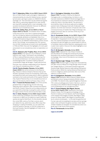 To book visit saga.co.uk/cruise 13saga.co.uk/su180Feb 17. Valparaiso, Chile. Arrive 0800. Depart 2200.Set on Chile%u2019s Pacific coast, photogenic Valparaiso is characterised by its colourful hillside homes, reached by funiculars, earning it a place on UNESCO%u2019s World Heritage List. This merchant city flourished during the 19th century, attracting migrants from near and far who have left a lasting imprint, most noticeably in the wooded neoclassical cathedral. Discover its di!erent districts on an included excursion.Feb 21-22. Callao, Peru. Arrive 0800 on Feb 21.Depart 1800 on Feb 22. The seaside resort of Callao is also the port for Lima, Peru%u2019s capital and largest city. Surrounded by deserts and backed by the Andes, it was originally declared uninhabitable. Now it is a thriving metropolis of skyscrapers, colonial gems and ancient ruins. Its UNESCO-listed historic centre, known as the %u2018City of Kings%u2019, encompasses the 17th-century church that miraculously survived Lima%u2019s earthquakes in 1746 and 1940. Discover the highlights of Lima%u2019s past and present on an included excursion or exploration on foot. Feb 24. Salaverry (for Trujillo), Peru. Arrive 0800.Depart 2000. From the port city of Salaverry, travel inland to visit Trujillo. This historic city, birthplace of Peru%u2019s national Marinera dance, is also known for its colonial architecture, rich culture and pre-Incan archaeological sites. Founded in 1534 by Spanish conquistador Diego de Almagro, Trujillo was the first Peruvian city to declare independence from Spanish rule. Enjoy an included excursion in Trujillo.Feb 28. Fuerte Amador, Panama. Arrive 0800.Depart 2000. Set at the entrance to the Panama Bay, Flamenco Island is linked to Panama City by the Amador Causeway. Known for its beaches, scenic pier, and waterfront bars and restaurants it o!ers a peaceful contrast to the hustle and bustle of the capital, Panama City. Explore Panama City on an included excursion or discover the historic district of Casco Viejo on foot.Mar 1. Transit the Panama Canal. One of the world%u2019s greatest feats of engineering, this 50-mile-long waterway which opened in 1914 connects the Atlantic and Pacific Oceans. Enjoy the surrounding scenery as you spend the whole day cruising this scenic stretch through a series of locks and across the Gatun Lake.Mar 2. Col%u00f3n, Panama. Arrive 0800. Depart 2100.Col%u00f3n marks the Caribbean end of the Panama Canal. It was born in 1850 out of a desire to reach California quickly during the Gold Rush. On the shoreline stands the ruined 16th-century Fort San Lorenzo which pre-dates the city, while Zona Libra o!ers duty-free shopping. In nearby Portobello, you can watch the colourful yachts in the bay, or hunt for treasures in the local markets. See the highlights of Col%u00f3n on an included excursion.Mar 4. Cartagena, Colombia. Arrive 0800.Depart 1700. Founded in 1533 by the Spanish, Cartagena sits in a sheltered bay. Its historic core has been declared a UNESCO World Heritage Site. It encompasses an extensive network of fortifications unlike any other in the New World. The old town is encircled by miles of old stone walls and is a tightly packed maze of alleyways lined with Andalusian-style palaces, churches and mansions. Of special note is the immense fortress of Castillo San F%u00e9lipe de Barajas, the largest of its kind. Gain an overview of the city on an included excursion.Mar 6. Oranjestad, Aruba. Arrive 0800. Depart 1700.With brightly coloured buildings that mirror those in Amsterdam, Oranjestad%u2019s Dutch heritage is clear to see. The capital Oranjestad combines European-style architecture with the sights you would expect to find on a Caribbean island, pristine beaches, swaying palms and crystal-clear waters. Discover the island highlights on an included excursion.Mar 8. St George%u2019s, Grenada. Arrive 0800.Depart 1900. Dubbed the %u2018Isle of Spice%u2019 thanks to the abundance of nutmeg and cinnamon found here, Grenada is the southernmost island of the Antilles archipelago. View more of the island on an included scenic drive.Mar 9. Scarborough, Tobago. Arrive 0800.Depart 1700. Scarborough is a lively town dominated by the 18th-century hilltop Fort King George, which houses the Tobago Museum. In the lower Scarborough area, Scarborough Market features stalls selling clothing and fresh produce. While the nearby Botanical Gardens are home to indigenous plants and trees. See more of the island on a scenic drive.Mar 10. Bridgetown, Barbados. Arrive 0800.Depart 1700. Barbados o!ers a blend of West African and British culture, having remained a British colony until 1966. The island%u2019s lively capital Bridgetown features 17th-century buildings and a historic Garrison, which is included on the UNESCO World Heritage list. Explore more of Barbados on an included excursion.Mar 17. Ponta Delgada, S%u00e3o Miguel, Azores.Arrive 0800. Depart 1700. Scattered in the North Atlantic Ocean, the Portuguese archipelago of the Azores is made up of nine islands, and Ponta Delgada is the capital of the largest of these, S%u00e3o Miguel. Aptly known as %u2018Green Island%u2019, S%u00e3o Miguel is characterised by its volcanic landscapes %u2013 to the east lies geothermal Furnas Lake with its bubbling fumeroles and hot springs, while in the northwest the green and blue crater lakes of Sete Cidades are situated. An included excursion is a great way to see more of the scenery.Mar 21. Portsmouth. Arrive 0700.