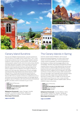 To book visit saga.co.uk/cruise 15Canary Island SunshineDiscover the UNESCO-listed landmarks, colourful architecture and rich history of Portugal%u2019s vibrant capital Lisbon. Then, cruise to the Canary Islands, known for their unusual volcanic scenery, traditions, culture and year-round sunshine. Visit Lanzarote and its peaceful capital Arrecife, where the nearby Cactus Garden and C%u00e9sar Manrique Foundation reveal more about the life and work of the island%u2019s most famous son. In Gran Canaria, with its beautiful coves, beaches and mountains, perhaps explore the historic neighbourhood of Vegueta in the capital Las Palmas or head to the charming, white-washed town of Puerto de Mog%u00e1n. Contrast the black sand beaches and volcanic terrain of Teide National Park in Tenerife with the extensive laurel forests of La Palma, the greenest of the Canaries. Its capital, Santa Cruz, features 16th-century Castilian architecture, cobbled lanes and an old quarter set around a Renaissance plaza. An overnight stay at the green island of Madeira, with its laurel forests and botanical garden, provides a scenic conclusion to your cruise.SHIP: Spirit of DiscoveryNIGHTS: 15INCLUDED EXCURSION IN EVERY PORTSAILING: January 20, 2027CRUISE CODE: SD204saga.co.uk/sd204Sailing from Portsmouth %u2022 Lisbon, Portugal %u2022 Arrecife, Lanzarote %u2022 Las Palmas, Gran Canaria %u2022 Santa Cruz, Tenerife %u2022 Santa Cruz, La Palma %u2022 Funchal, Madeira. Returning to Portsmouth.The Canary Islands in SpringVisit the verdant island of Madeira, with its laurel forests and botanical garden, en route to the Canary Islands, renowned for their year-round sunshine and unique volcanic landscapes. Contrast the greenest of the Canaries, La Palma, with the largest island in the archipelago, Tenerife, where black sand beaches and the unusual volcanic terrain of Teide National Park can be seen. In Gran Canaria, an island fringed with beautiful coves and beaches to the south and mountains to the north, perhaps explore the historic neighbourhood of Vegueta in the capital Las Palmas or head to the picturesque, white-washed town of Puerto de Mog%u00e1n. Visit Lanzarote and its peaceful capital Arrecife, where the nearby Cactus Garden and C%u00e9sar Manrique Foundation o\of the island%u2019s most famous son. Your cruise concludes with a visit to Portugal%u2019s colourful capital Lisbon, with its UNESCO-listed monuments.SHIP: Spirit of DiscoveryNIGHTS: 14INCLUDED EXCURSION IN EVERY PORTSAILING: March 24, 2027CRUISE CODE: SD208saga.co.uk/sd208Sailing from Portsmouth %u2022 Funchal, Madeira %u2022 Santa Cruz, La Palma %u2022 Santa Cruz, Tenerife %u2022 Las Palmas, Gran Canaria %u2022 Arrecife, Lanzarote %u2022 Lisbon, Portugal. Returning to Portsmouth.SINTRA, PORTUGALMOUNT TEIDE, TENERIFELA PALMA