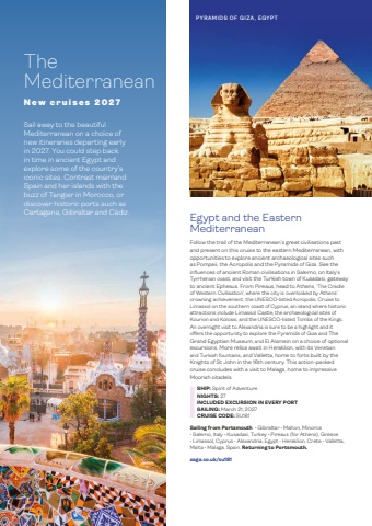 The MediterraneanNew cruises 2027Sailing from Portsmouth %u2022 Gibraltar %u2022 Mahon, Minorca %u2022 Salerno, Italy %u2022 Kusadasi, Turkey %u2022 Pireaus (for Athens), Greece %u2022 Limassol, Cyprus %u2022 Alexandria, Egypt %u2022 Heraklion, Crete %u2022 Valletta, Malta %u2022 Malaga, Spain. Returning to Portsmouth.Egypt and the Eastern MediterraneanFollow the trail of the Mediterranean%u2019s great civilisations past and present on this cruise to the eastern Mediterranean, with opportunities to explore ancient archaeological sites such as Pompeii, the Acropolis and the Pyramids of Giza. See the influences of ancient Roman civilisations in Salerno, on Italy%u2019s Tyrrhenian coast, and visit the Turkish town of Kusadasi, gateway to ancient Ephesus. From Pireaus, head to Athens, %u2018The Cradle of Western Civilisation%u2019, where the city is overlooked by Athens%u2019 crowning achievement, the UNESCO-listed Acropolis. Cruise to Limassol on the southern coast of Cyprus, an island where historic attractions include Limassol Castle, the archaeological sites of Kourion and Kolossi, and the UNESCO-listed Tombs of the Kings. An overnight visit to Alexandria is sure to be a highlight and it o\Grand Egyptian Museum, and El Alamein on a choice of optional excursions. More relics await in Heraklion, with its Venetian and Turkish fountains, and Valletta, home to forts built by the Knights of St John in the 16th century. This action-packed cruise concludes with a visit to Malaga, home to impressive Moorish citadels.SHIP: Spirit of AdventureNIGHTS: 27INCLUDED EXCURSION IN EVERY PORTSAILING: March 21, 2027CRUISE CODE: SU181saga.co.uk/su181Sail away to the beautiful Mediterranean on a choice of new itineraries departing early in 2027. You could step back in time in ancient Egypt and explore some of the country%u2019s iconic sites. Contrast mainland Spain and her islands with the buzz of Tangier in Morocco, or discover historic ports such as Cartagena, Gibraltar and C%u00e1diz. PYRAMIDS OF GIZA, EGYPT16