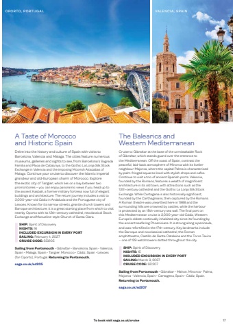 To book visit saga.co.uk/cruise 17A Taste of Morocco and Historic SpainDelve into the history and culture of Spain with visits to Barcelona, Valencia and Malaga. The cities feature numerous museums, galleries and sights to see, from Barcelona%u2019s Sagrada Familia and Placa de Catalunya, to the Gothic La Lonja Silk Stock Exchange in Valencia and the imposing Moorish Alcazabas of Malaga. Continue your cruise to discover the Islamic imperial grandeur and old-European charm of Morocco. Explore the exotic city of Tangier, which lies on a bay between two promontories %u2013 you can enjoy panoramic views if you head up to the ancient Kasbah, a former military fortress now full of elegant buildings and architecture. The return journey includes a visit to 3,000-year-old C%u00e1diz in Andalusia and the Portuguese city of Leixoes. Known for its narrow streets, granite church towers and Baroque architecture, it is a great starting place from which to visit nearby Oporto with its 12th-century cathedral, neoclassical Stock Exchange and Manueline-style Church of Santa Clara.SHIP: Spirit of DiscoveryNIGHTS: 16INCLUDED EXCURSION IN EVERY PORTSAILING: February 4, 2027CRUISE CODE: SD205saga.co.uk/sd205Sailing from Portsmouth %u2022 Gibraltar %u2022 Barcelona, Spain %u2022 Valencia, Spain %u2022 Malaga, Spain %u2022 Tangier, Morocco %u2022 C%u00e1diz, Spain %u2022 Leixoes (for Oporto), Portugal. Returning to Portsmouth.The Balearics and Western MediterraneanCruise to Gibraltar at the base of the unmistakable Rock of Gibraltar, which stands guard over the entrance to the Mediterranean. O\peaceful, laid-back atmosphere of Minorca with its livelier neighbour Majorca, where the capital Palma is characterised by palm-fringed squares lined with stylish shops and cafes. Continue to visit a trio of ancient Spanish ports. Valencia, founded by the Romans, features a wealth of magnificent architecture in its old town, with attractions such as the 13th-century cathedral and the Gothic La Lonja Silk Stock Exchange. While Cartagena is also historically significant, founded by the Carthaginians, then captured by the Romans. A Roman theatre was unearthed here in 1988 and the surrounding hills are crowned by castles, while the harbour is protected by an 18th-century sea wall. The final port on this Mediterranean cruise is 3,000-year-old C%u00e1diz, Western Europe%u2019s oldest continually inhabited city since its founding by the ancient seafaring Phoenicians. It is strung along a peninsula, and was refortified in the 17th-century. Key landmarks include the Baroque and neoclassical cathedral, the Roman amphitheatre, Castillo de Santa Catalaina and the Torre Tavira %u2013 one of 129 watchtowers dotted throughout the city.SHIP: Spirit of DiscoveryNIGHTS: 15INCLUDED EXCURSION IN EVERY PORTSAILING: March 9, 2027CRUISE CODE: SD207saga.co.uk/sd207Sailing from Portsmouth %u2022 Gibraltar %u2022 Mahon, Minorca %u2022 Palma, Majorca %u2022 Valencia, Spain %u2022 Cartagena, Spain %u2022 C%u00e1diz, Spain. Returning to Portsmouth.OPORTO, PORTUGAL VALENCIA, SPAIN