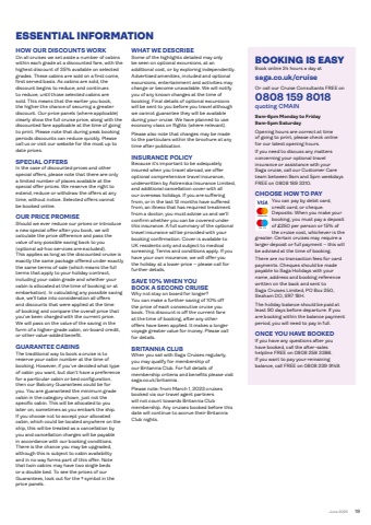 June 2025 19HOW OUR DISCOUNTS WORKOn all cruises we set aside a number of cabins within each grade at a discounted fare, with the highest discount of 35% available on selected grades. These cabins are sold on a first come, first served basis. As cabins are sold, the discount begins to reduce, and continues to reduce, until those selected cabins are sold. This means that the earlier you book, the higher the chance of securing a greater discount. Our price panels (where applicable) clearly show the full cruise price, along with the discounted fare applicable at the time of going to print. Please note that during peak booking periods discounts can reduce quickly. Please call us or visit our website for the most up to date prices.SPECIAL OFFERSIn the case of discounted prices and other special offers, please note that there are only a limited number of places available at the special offer prices. We reserve the right to extend, reduce or withdraw the offers at any time, without notice. Selected offers cannot be booked online.OUR PRICE PROMISEShould we ever reduce our prices or introduce a new special offer after you book, we will calculate the price difference and pass the value of any possible saving back to you (optional ad-hoc services are excluded). This applies as long as the discounted cruise is exactly the same package offered under exactly the same terms of sale (which means the full terms that apply to your holiday contract, including your cabin grade and whether your cabin is allocated at the time of booking or at embarkation). In calculating any possible saving due, we%u2019ll take into consideration all offers and discounts that were applied at the time of booking and compare the overall price that you%u2019ve been charged with the current price. We will pass on the value of the saving in the form of a higher-grade cabin, on-board credit, or other value-added benefit.GUARANTEE CABINSThe traditional way to book a cruise is to reserve your cabin number at the time of booking. However, if you%u2019ve decided what type of cabin you want, but don%u2019t have a preference for a particular cabin or bed configuration, then our Balcony Guarantees could be for you. You are guaranteed the minimum grade cabin in the category shown, just not the specific cabin. This will be allocated to you later on, sometimes as you embark the ship. If you choose not to accept your allocated cabin, which could be located anywhere on the ship, this will be treated as a cancellation by you and cancellation charges will be payable in accordance with our booking conditions. There is the chance you may be upgraded, although this is subject to cabin availability and in no way forms part of this offer. Note that twin cabins may have two single beds or a double bed. To see the prices of our Guarantees, look out for the %u2021 symbol in the price panels.WHAT WE DESCRIBESome of the highlights detailed may only be seen on optional excursions, at an additional cost, or by exploring independently. Advertised amenities, included and optional excursions, entertainment and activities may change or become unavailable. We will notify you of any known changes at the time of booking. Final details of optional excursions will be sent to you before you travel although we cannot guarantee they will be available during your cruise. We have planned to use economy class on flights (where relevant).Please also note that changes may be made to the particulars within the brochure at any time after publication.INSURANCE POLICYBecause it%u2019s important to be adequately insured when you travel abroad, we offer optional comprehensive travel insurance, underwritten by Astrenska Insurance Limited, and additional cancellation cover with all our overseas holidays. If you are suffering from, or in the last 12 months have suffered from, an illness that has required treatment from a doctor, you must advise us and we%u2019ll confirm whether you can be covered under this insurance. A full summary of the optional travel insurance will be provided with your booking confirmation. Cover is available to UK residents only and subject to medical screening. Terms and conditions apply. If you have your own insurance, we will offer you the holiday at a lower price %u2013 please call for further details.SAVE 10% WHEN YOU BOOK A SECOND CRUISEWhy not stay on board for longer? You can make a further saving of 10% off the price of each consecutive cruise you book. This discount is off the current fare at the time of booking, after any other offers have been applied. It makes a longer voyage greater value for money. Please call for details.BRITANNIA CLUBWhen you sail with Saga Cruises regularly, you may qualify for membership of our Britannia Club. For full details of membership criteria and benefits please visit saga.co.uk/britannia.Please note: from March 1, 2023 cruises booked via our travel agent partners will not count towards Britannia Club membership. Any cruises booked before this date will continue to accrue their Britannia Club nights.ESSENTIAL INFORMATIONBOOKING IS EASYBook online 24 hours a day atsaga.co.uk/cruiseOr call our Cruise Consultants FREE on0808 159 8018quoting CMAIN9am-6pm Monday to Friday9am-5pm Saturday Opening hours are correct at time of going to print, please check online for our latest opening hours.If you need to discuss any matters concerning your optional travel insurance or assistance with your Saga cruise, call our Customer Care team between 9am and 5pm weekdays FREE on 0808 189 3310.CHOOSE HOW TO PAYYou can pay by debit card, credit card, or cheque.Deposits: When you make your booking, you must pay a deposit of %u00a3250 per person or 15% of the cruise cost, whichever is the greater. Certain cruises may require a larger deposit or full payment %u2013 this will be advised at the time of booking.There are no transaction fees for card payments. Cheques should be made payable to Saga Holidays with your name, address and booking ref