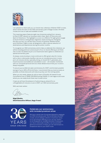 2I am pleased to share with you our brand-new collection of Winter 2027 cruises, which marks the start of the 30th anniversary year of Saga Cruises. All these cruises are now on sale and available to book.This inspiring season features eight new itineraries sailing from January to March 2027 aboard our boutique sister ships, Spirit of Discovery and Spirit of Adventure. The highlight is a once-in-a-lifetime 73-night grand voyage to South America visiting Brazil, Argentina, Chile and beyond. Alongside this epic journey, you will also find a choice of Canaries, Mediterranean and a Northern Lights cruise, all designed to offer a diverse selection of destinations and experiences during the winter months.To recognise our 30th anniversary and to help us celebrate this milestone, we will be including premium wines as part of our on-board offering on all these new cruises. So please do join us on board and raise a glass to celebrate our special anniversary year. As always, every boutique cruise continues to offer great value for money with a return nationwide chauffeur service, an included excursion in every port, all-inclusive drinks, speciality dining, on-board Wi-Fi, gratuities, plus travel insurance and additional cancellation cover %u2013 all included. Combined with our renowned personal service, these details ensure that your cruise is always enjoyable.To secure your preferred cabin and itinerary for 2027, and the best possible savings of up to 35% off the full fares, I recommend that you book as early as possible, as these discounts will reduce quickly over the coming weeks.When you are ready, please do call my team of friendly UK-based Cruise Consultants free on 0808 159 8018 quoting CMAIN, or visit saga.co.uk/cruise where you can easily book these new cruises online.I hope we will have the pleasure of welcoming you aboard for an unforgettable all-inclusive cruise in 2027, our 30th anniversary year.With warmest wishesNigel Blanks, Chief Executive Officer, Saga TravelYEARSSAGA CRUISESWe have a whole host of surprises planned to celebrate our 30th anniversary year. And on all these new 2027 cruises, we are adding a selection of premium wines to our all-inclusive offering, so you can say 'cheers' on us! Along with an included excursion in every port, our return nationwide chauffeur service and other generous inclusions, it means you can look forward to exceptional value on your 2027 cruise.Celebrate our anniversary with included premium wines