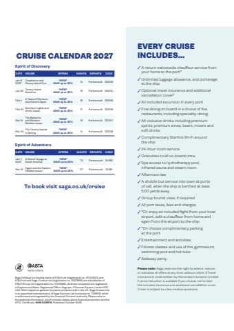 EVERY CRUISE INCLUDES...A return nationwide chau!eur service from your home to the port* Unlimited luggage allowance, and porterage at the ship Optional travel insurance and additional cancellation cover%u00a7An included excursion in every portFine dining on board in a choice of five restaurants, including speciality dining All-inclusive drinks including premium spirits, premium wines, beers, mixers and soft drinks Complimentary Starlink Wi-Fi around the ship 24-hour room service Gratuities to all on-board crew Spa access to hydrotherapy pool, infrared sauna and steam room Afternoon tea A shuttle bus service into town at ports of call, when the ship is berthed at least 500 yards away Group tourist visas, if required All port taxes, fees and charges*Or enjoy an included flight from your local airport, with a chau!eur from home and again from the airport to the ship *Or choose complimentary parking at the portEntertainment and activities Fitness classes and use of the gymnasium, swimming pool and hot tubs Sailaway party.Please note: Saga reserves the right to extend, reduce, or withdraw all o!ers at any time, without notice. %u00a7Travel insurance is underwritten by Astrenska Insurance Limited. A price reduction is available if you choose not to take the included insurance and additional cancellation cover. Cover is subject to a few medical questions.Saga Holidays is a trading name of ST&H Ltd (registration no. 21740520) and ST&H Ltd and Saga Cruises Ltd (registration no. 3267858) are subsidiaries of ST&H Group Ltd (registration no. 0720588). All three companies are registered in England and Wales. Registered O!ce: Saga plc, 3 Pancras Square, London N1C 4AG. With respect to general insurance products sold in the UK, Saga Cruises Ltd is an appointed representative of Saga Services Ltd (company no. 732602) which is authorised and regulated by the Financial Conduct Authority. Please refer to the essential information, which includes details about financial protection and the ATOL Certificate. NHB-SC9979. Published October 2025.To book visit saga.co.uk/cruiseCRUISE CALENDAR 2027Spirit of DiscoveryDATE CRUISE OFFERS NIGHTS DEPARTS CODEJan 6, 2027Casablanca and Canary Island Duo*NEW* SAVE up to 35% 14 Portsmouth SD203Jan 20 Canary Island Sunshine*NEW* SAVE up to 35% 15 Portsmouth SD204Feb 4 A Taste of Morocco and Historic Spain*NEW* SAVE up to 35% 16 Portsmouth SD205Feb 20 Northern Lights and Arctic Vistas*NEW* SAVE up to 35% 17 Portsmouth SD206Mar 9 The Balearics and Western Mediterranean*NEW* SAVE up to 35% 15 Portsmouth SD207Mar 24 The Canary Islands in Spring*NEW* SAVE up to 35% 14 Portsmouth SD208Spirit of AdventureDATE CRUISE OFFERS NIGHTS DEPARTS CODEJan 7, 2027A Grand Voyage to South America*NEW* SAVE up to 35% 73 Portsmouth SU180Mar 21 Egypt and the Eastern Mediterranean*NEW* SAVE up to 35% 27 Portsmouth SU181