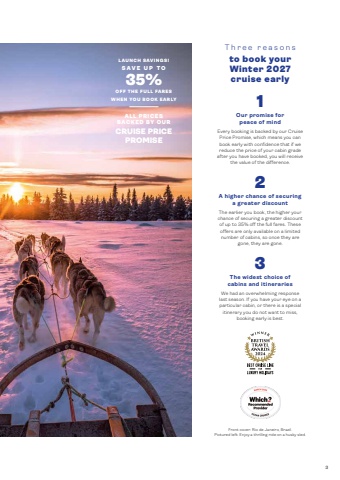31Our promise for peace of mindEvery booking is backed by our Cruise Price Promise, which means you can book early with confidence that if we reduce the price of your cabin grade after you have booked, you will receive the value of the difference.2A higher chance of securing a greater discountThe earlier you book, the higher your chance of securing a greater discount of up to 35% off the full fares. These offers are only available on a limited number of cabins, so once they are gone, they are gone.3The widest choice of cabins and itinerariesWe had an overwhelming response last season. If you have your eye on a particular cabin, or there is a special itinerary you do not want to miss, booking early is best.Front cover: Rio de Janeiro, Brazil. Pictured left: Enjoy a thrilling ride on a husky sled.LAUNCH SAVINGS!SAVE UP TOOFF THE FULL FARES35%WHEN YOU BOOK EARLYALL PRICES BACKED BY OURCRUISE PRICE PROMISEThree reasonsto book your Winter 2027 cruise early