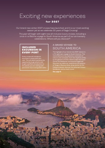 4The highlight of our brand-new 2027 season is a 73-night epic voyage to South America. This remarkable journey explores a continent of colours and contrasts, from the rhythms of Rio to the glaciers of Chile. Stand under the iconic Christ the Redeemer and ascend Sugarloaf Mountain by cable car, experience the passion of Tango in Buenos Aires, drop anchor at the Falkland Islands, discover the ethereal Chilean fjordlands, and so much more!See page 8.A GRAND VOYAGE TO SOUTH AMERICAEvery cruise will include an excursion in every port you visit. This will allow everyone the opportunity to go ashore, and to get a perfect introduction to the places you are visiting with panoramic tours and guided walks.INCLUDED EXCURSION IN EVERY PORTOur brand-new winter 2027 cruises have launched, and it is our most exciting season yet as we celebrate 30 years of Saga Cruising! The year will begin with eight new all-inclusive luxury cruises, including a once-in-a-lifetime voyage to South America as part of our anniversary celebrations. Where will you discover?Exciting new experiencesfor 2027