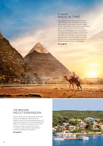 6THE WESTERNMEDITERRANEANEarly in 2027, you can also enjoy a boutique cruise to the Balearic Islands and the Western Med. From the bustling harbours of Valencia and Mahon to the tranquil beauty of Majorca%u2019s Valldemossa village, look forward to Spain%u2019s vibrant contrast of cultures. You will also visit Gibraltar, famed for its mischievous Barbary macaques!See page 17.A CRUISEBACK IN TIMEFollowing her return from South America, Spirit of Adventure will embark on another new itinerary to the exotic shores of Egypt, Turkey, Italy, Malta, Crete, Cyprus and Greece. Get up close to some of history%u2019s most famous archaeological sites, from Pompeii and Ephesus to the Acropolis of Athens and Heraklion. An overnight call to Alexandria also means you can join an optional tour to Cairo and the Pyramids of Giza, to see the only one of the original Seven Wonders of the Ancient World that is still standing.See page 16.
