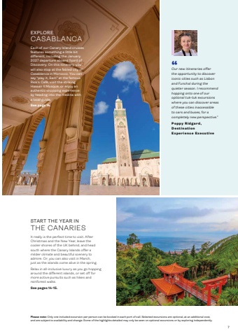 7Please note: Only one included excursion per person can be booked in each port of call. Selected excursions are optional, at an additional cost, and are subject to availability and change. Some of the highlights detailed may only be seen on optional excursions or by exploring independently.It really is the perfect time to visit. After Christmas and the New Year, leave the cooler shores of the UK behind, and head south where the Canary Islands offer a milder climate and beautiful scenery to admire. Or, you can also visit in March, just as the islands come alive in the spring. Relax in all-inclusive luxury as you go hopping around the different islands, or set off for more active pursuits such as hikes and rainforest walks. See pages 14-15.START THE YEAR INTHE CANARIESEXPLORECASABLANCAEach of our Canary Island cruises features something a little bit different, including the January 2027 departure aboard Spirit of Discovery. On this itinerary, you will also stop at the fabled city of Casablanca in Morocco. You can say %u201cplay it, Sam%u201d at the famous Rick%u2019s Caf%u00e9, visit the striking Hassan II Mosque, or enjoy an authentic shopping experience by heading into the medina with a local guide.See page 14.Our new itineraries offer the opportunity to discover iconic cities such as Lisbon and Funchal during the quieter season. I recommend hopping onto one of our optional tuk-tuk excursions where you can discover areas of these cities inaccessible to cars and buses, for a completely new perspective.%u201dPoppy Ridgard, Destination Experience Executive%u201c