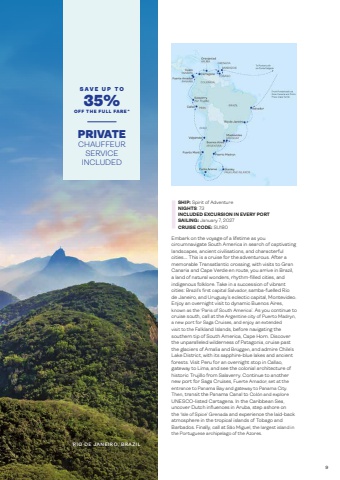 9Embark on the voyage of a lifetime as you circumnavigate South America in search of captivating landscapes, ancient civilisations, and characterful cities%u2026. This is a cruise for the adventurous. After a memorable Transatlantic crossing, with visits to Gran Canaria and Cape Verde en route, you arrive in Brazil, a land of natural wonders, rhythm-filled cities, and indigenous folklore. Take in a succession of vibrant cities: Brazil%u2019s first capital Salvador, samba-fuelled Rio de Janeiro, and Uruguay%u2019s eclectic capital, Montevideo. Enjoy an overnight visit to dynamic Buenos Aires, known as the %u2018Paris of South America%u2019. As you continue to cruise south, call at the Argentine city of Puerto Madryn, a new port for Saga Cruises, and enjoy an extended visit to the Falkland Islands, before navigating the southern tip of South America, Cape Horn. Discover the unparalleled wilderness of Patagonia, cruise past the glaciers of Amalia and Br%u00fcggen, and admire Chile%u2019s Lake District, with its sapphire-blue lakes and ancient forests. Visit Peru for an overnight stop in Callao, gateway to Lima, and see the colonial architecture of historic Trujillo from Salaverry. Continue to another new port for Saga Cruises, Fuerte Amador, set at the entrance to Panama Bay and gateway to Panama City. Then, transit the Panama Canal to Col%u00f3n and explore UNESCO-listed Cartagena. In the Caribbean Sea, uncover Dutch influences in Aruba, step ashore on the %u2018Isle of Spice%u2019 Grenada and experience the laid-back atmosphere in the tropical islands of Tobago and Barbados. Finally, call at S%u00e3o Miguel, the largest island in the Portuguese archipelago of the Azores.SHIP: Spirit of AdventureNIGHTS: 73INCLUDED EXCURSION IN EVERY PORTSAILING: January 7, 2027CRUISE CODE: SU180PRIVATE CHAUFFEUR SERVICE INCLUDEDSAVE UP TOOFF THE FULL FARE^35%RIO DE JANEIRO, BRAZIL
